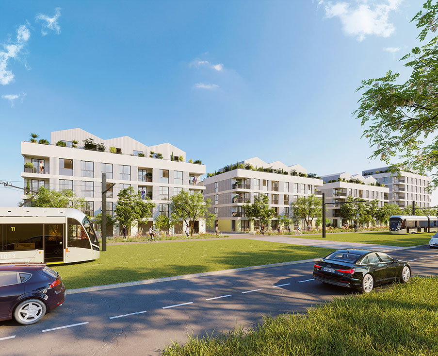 "Notre projet répond au caractère très particulier de la parcelle qui se situe au carrefourdes éléments urbains et paysagers importants de l’éco-quartier : la place, l’arrêt dutram, le parc et l’étang. Un front urbain percé et l’implantation ciselée des volumespermettent de ramener le paysage environnant à l’intérieur du projet et de maximiserl’espace vert au coeur de l’ilot, tout en donnant une image calme et rythmée vers la ville.Le traitement des volumes ainsi que l’écriture des façades enbandeaux texturées donnent différentes échelles de lecture auxvolumes qui sont également dotés de généreuses ouvertures."
