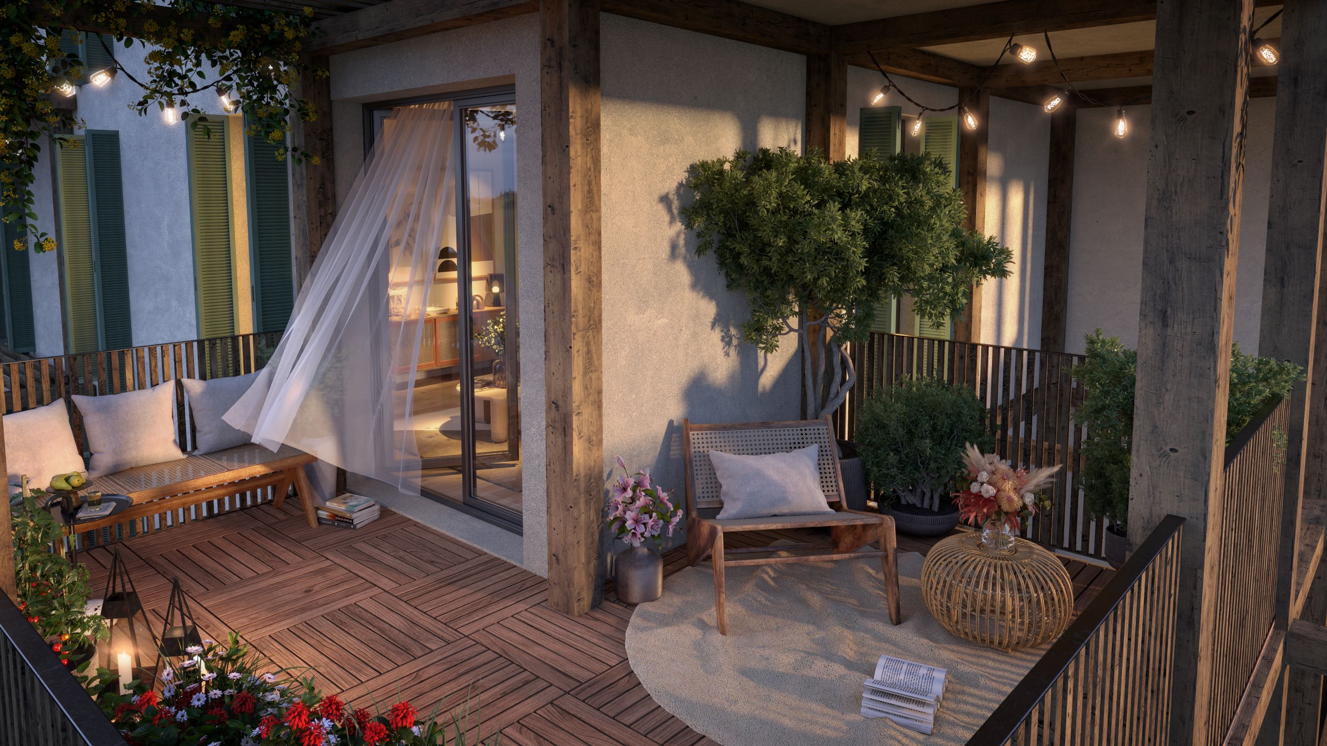 La résidence propose deux typologies de bâtiments qui se distinguent par les jeux de motifs en façade. Les bâtiments de logements collectifs sont construits de façon à conserver une homogénéité sur une typologie qui varie, avec un enduit gratté fin, faisant ressortir l’exosquelette en bois des parties extérieures. Les maisons, quant à elles, sont ornées d’un bardage, intelligemment manipulé pour distinguer les parties hautes et basses des habitations : un bardage rainuré au ton brun pour le soubassement, un bardage clin en bois plus clair pour les étages. Par ces effets, les maisons, disposées en quinconce, s’intègrent avec douceur dans leur environnement, pour une atmosphère paisible au quotidien.